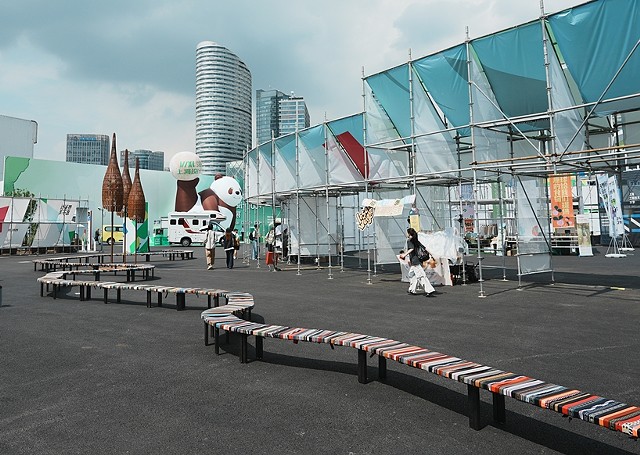 These reused belts are symbols of connections. This winding bench takes the shape of Shanghai’s Huangpu River symbolizing its growing ties with the world and endless cycles of life, a legacy passed down from one generation to the next, connecting people from the world.